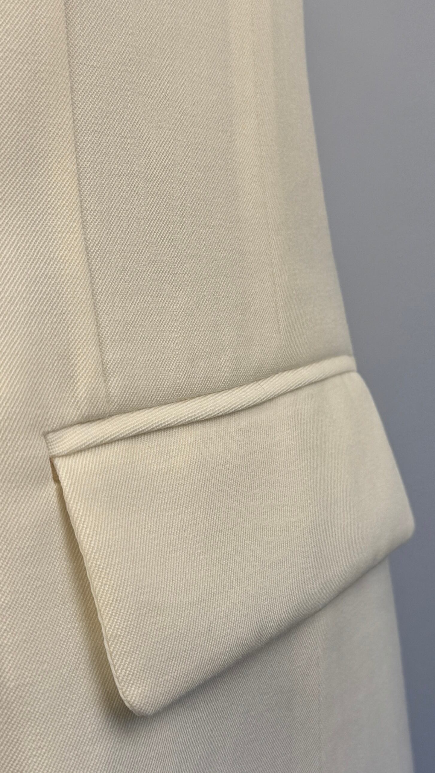マニッシュにもフェミニンにも着れるジレ(オフホワイト)は、スタイルに豊かな表情を加える確かな選択です。軽やかなウール素材は、快適さを提供し、様々なシーンに自然と馴染みます。フロントがダブル仕立てになっているため、前を開けてパンツと合わせるとマニッシュな雰囲気に、スカートと組み合わせてもボディラインを拾わないシルエットでエレガントさを演出します。シンプルかつ洗練されたデザインは、どんなコーディネートにも取り入れやすく、またレイヤリングを楽しむのにぴったりで、季節を問わず、長い間お召しいただけることでしょう。