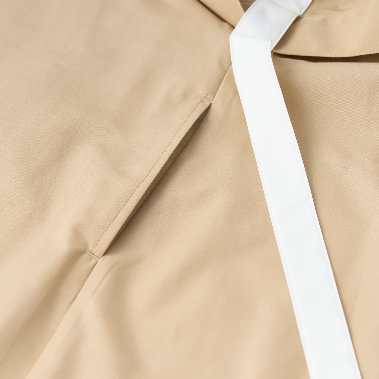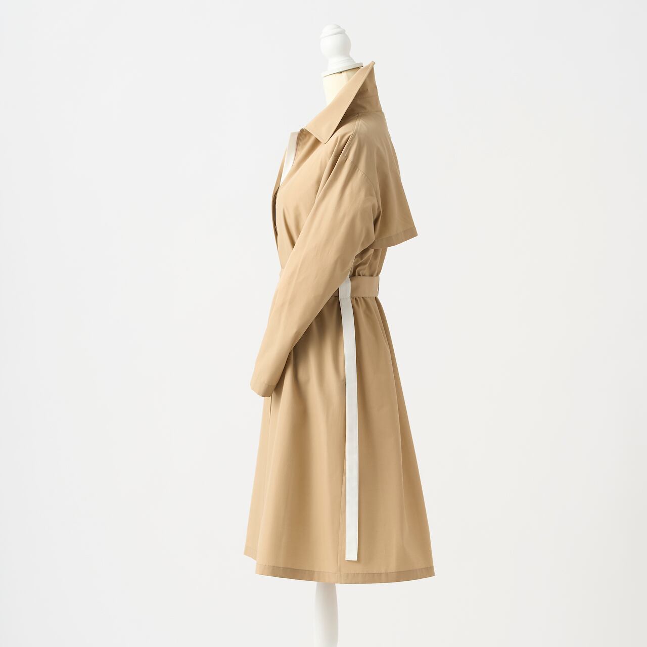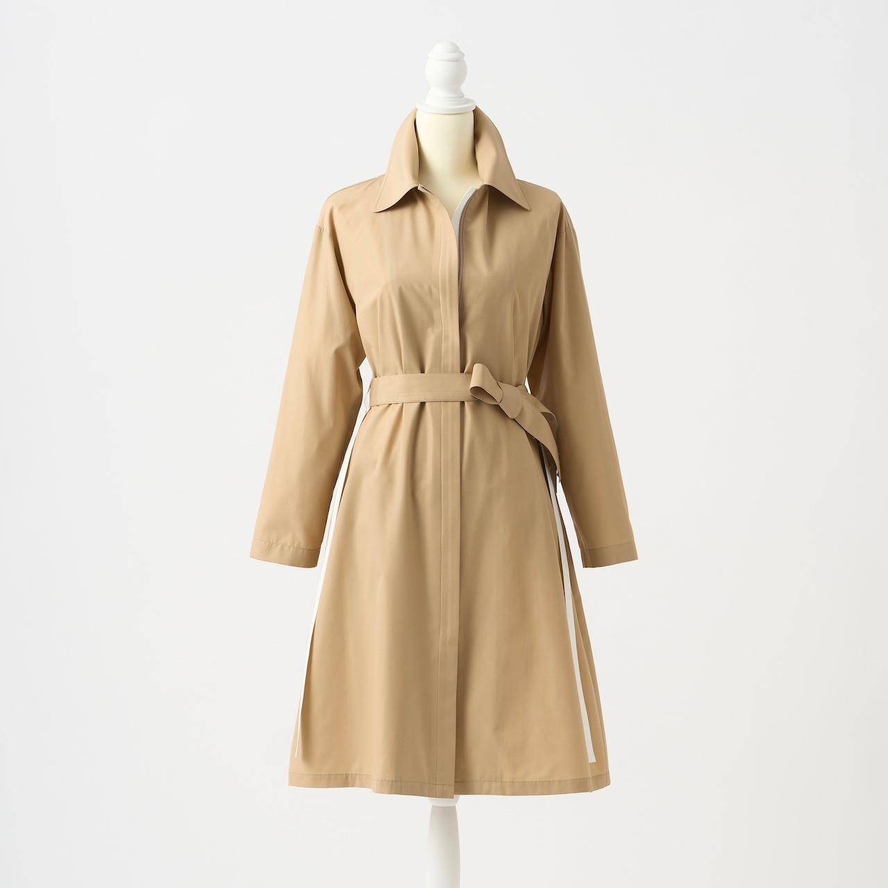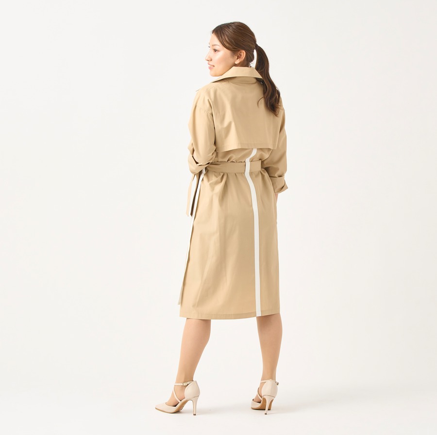 ベージュ地に白のラインが、程良いエレガントさと清潔感のあるコートに仕立てています。