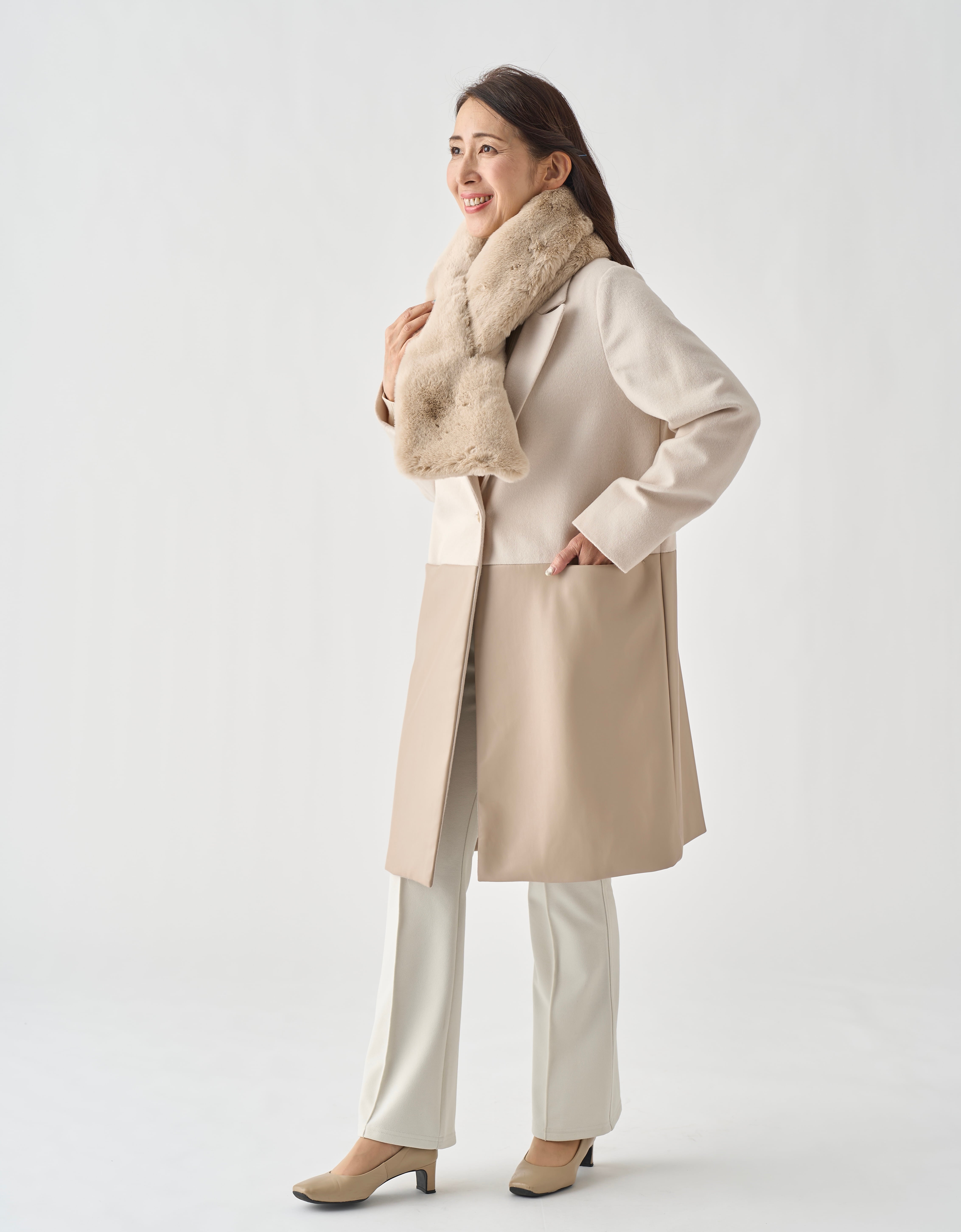 カシミア混ウール × フェイクレザー切り替えレディースミドル丈コート(ベージュ) フェイクファーマフラー付き