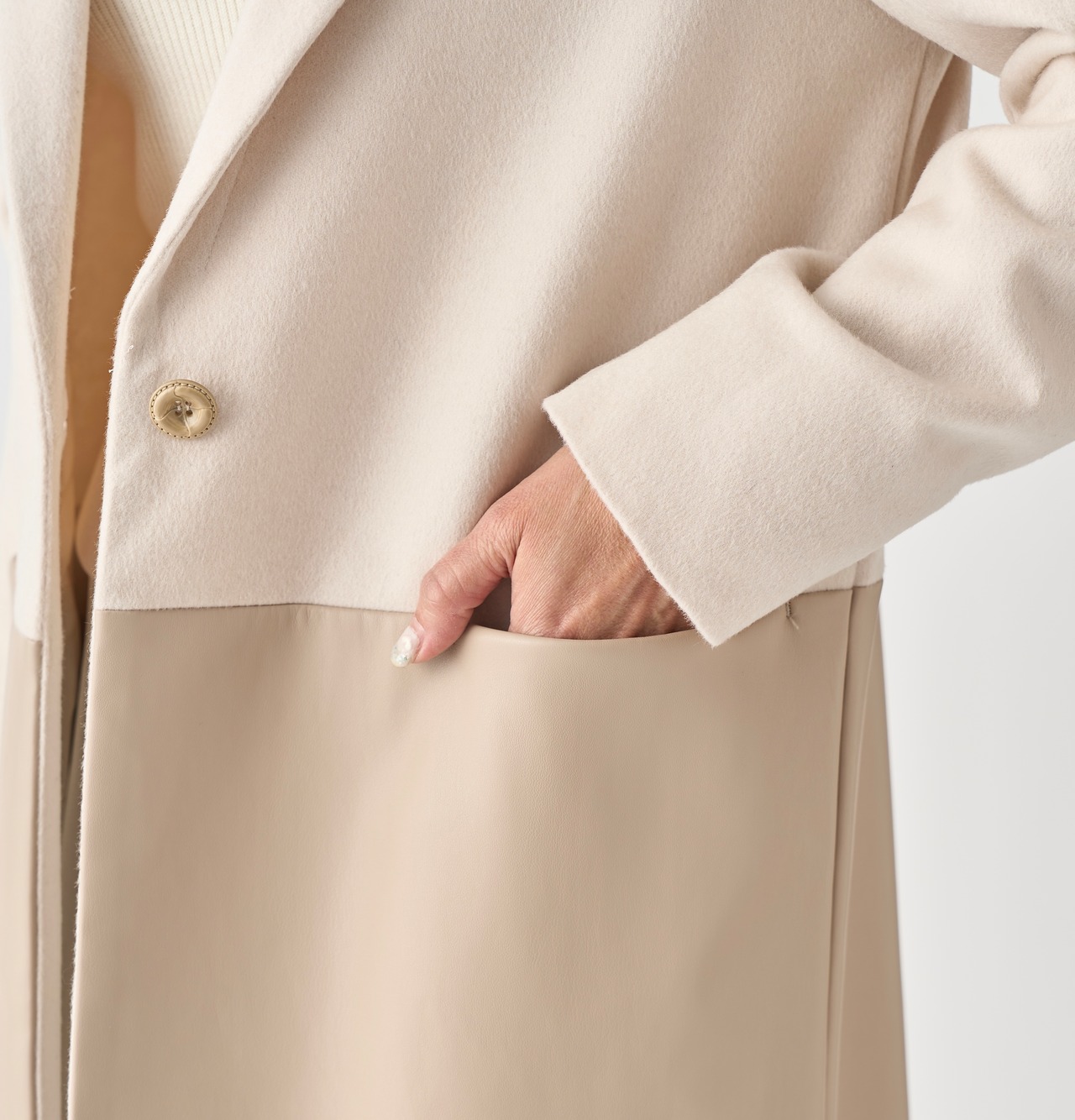 カシミア混ウール × フェイクレザー切り替えレディースミドル丈コートは、寒い季節に最適な1着です。カシミア混のウール素材を使用しているため、軽くて暖かく、防寒性に富んでいます。